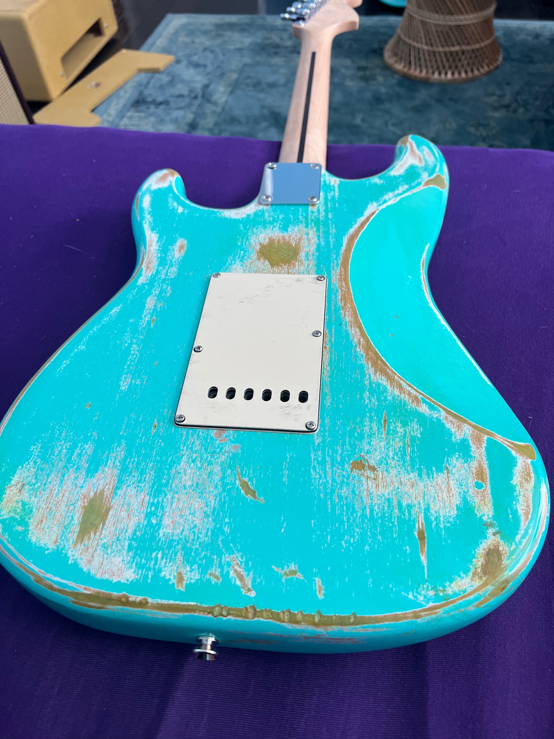 BodyReal Life Relics body is gorgeous seafoam green alder with very tasteful relicing. The thin satin nitro finish really lets the body resonate and feels and sounds great to play. It is lovely to touch and admire, and begs to be played! I paired it with off-white knobs and parchment pickup covers, and a beautiful anodized gold with paisley engraved pattern from Perle pickguards. The anodized gold is fully shielded and helps keep idle noise to a minimum. The wiring itself is premium gavitt pushback cloth wiring, wired with kestrel 60/40 solder and using only highest quality CTS pots and CRL switches. Tone cap is premium though i forget which brand (orange drop, sozo etc). If you really need I can check but will require a restring. Output jack is a PureTone, and the bottom tone pot is a push pull to activate the neck pickup in any position, giving you a total of 7 pickup combinations and the bridge/neck tele combo sounds great with these pickups.