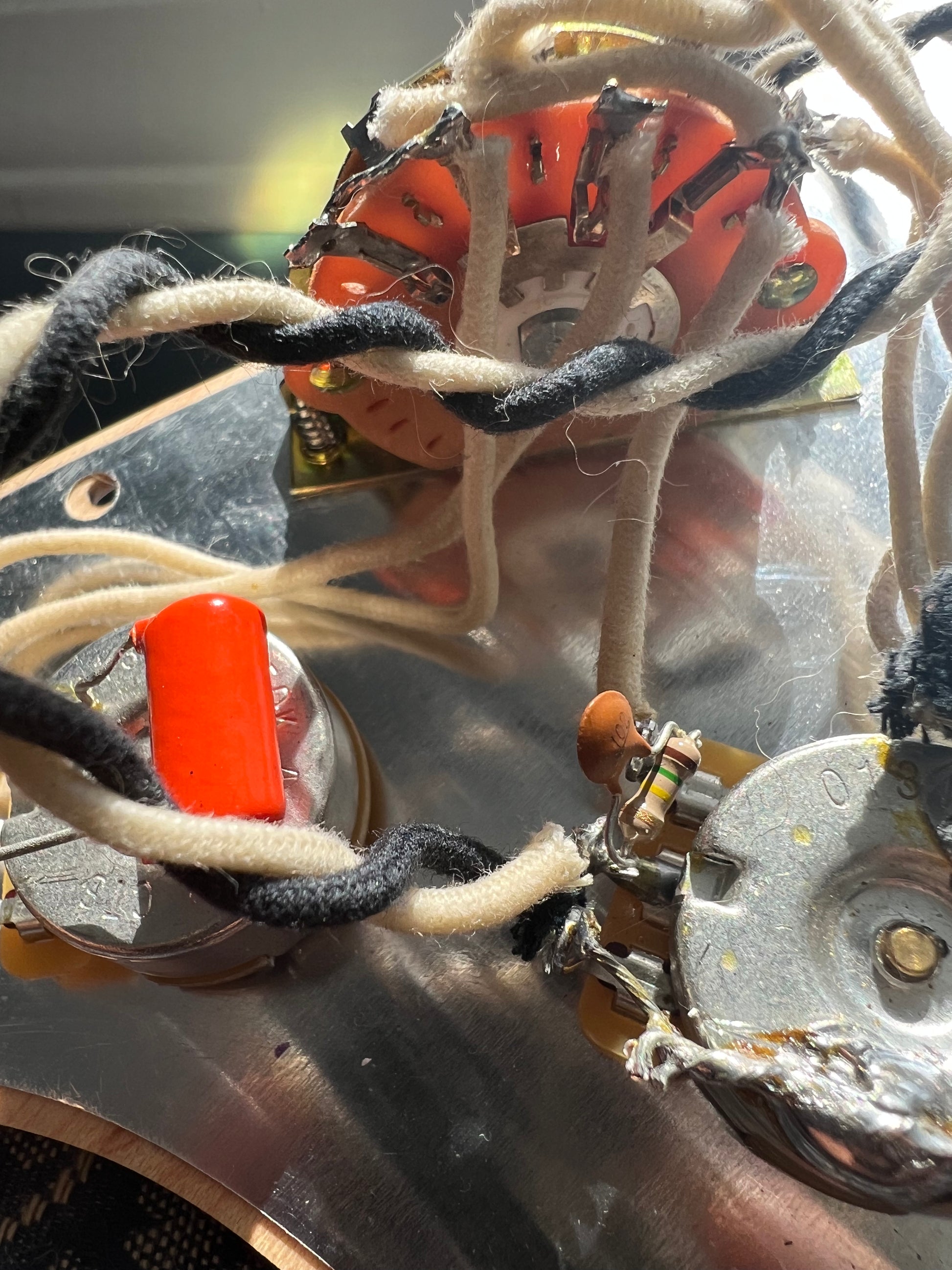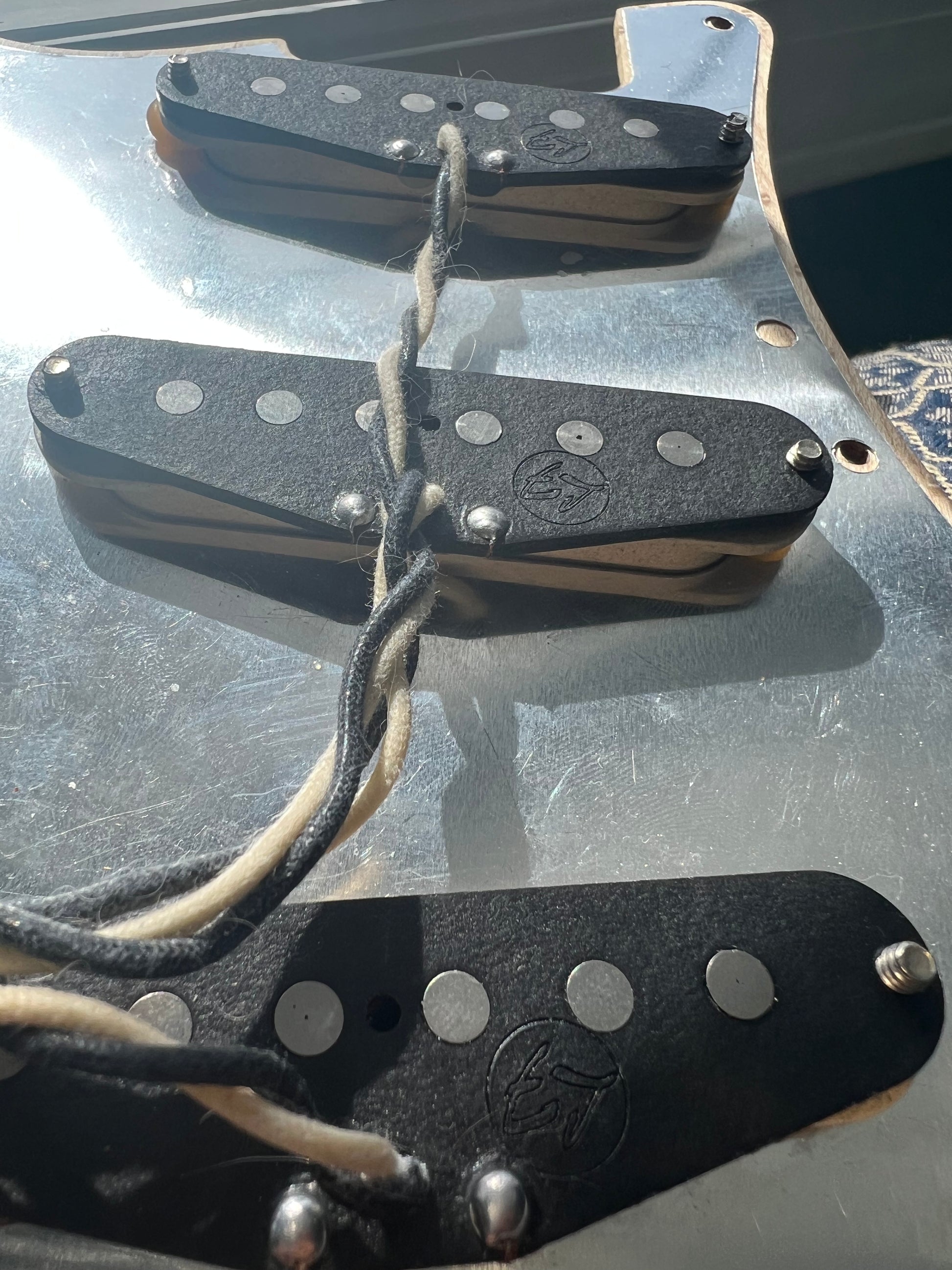 Loaded into a beautifully hand made birdseye maple pickguard from VanDyke Harms, and wired with premium components and wiring (CTS pots, CRL Switches, Orange Drop caps, Gavitt wire) standard 5-way switching and treble bleed circuit on master volume to retain highs when rolling back the volume. makes the volume knob much more usable to dial back the gain while playing and retaining rest of your guitars tone. The wooden pickguard is simply stunning, with the wenge stripe in the middle. It also has the extra cutout so it will fit in strats with the 22 fret fretboard extension. Will include relic’d pickup covers, knobs and switch tip from Real Life Relics as well (~$40)